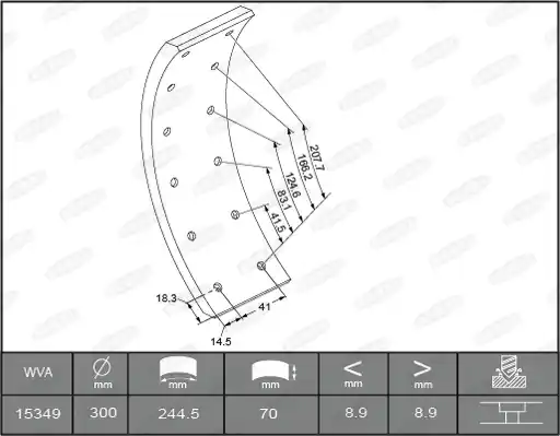 Binnen lengte [mm]: 288, 245 Buiten lengte [mm]: 307, 261 Remblok/voering: 1e ondermaat